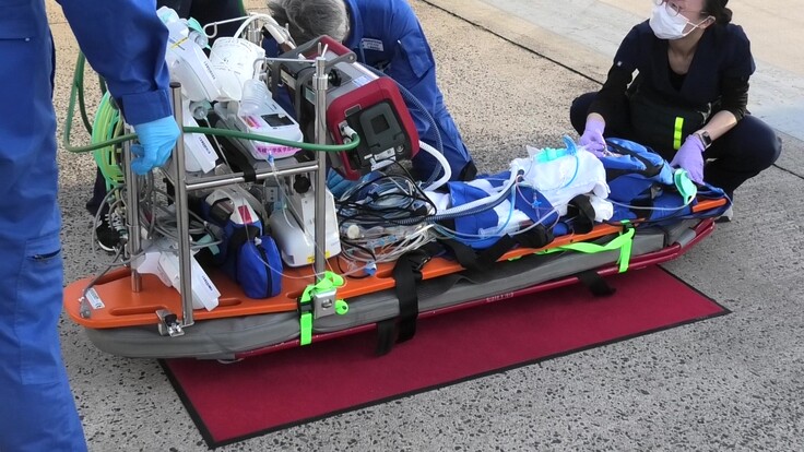患児は長期間人工呼吸器管理をされており、搬送中も人工呼吸管理が必要で、救急車と航空機との間の移動時には、自発呼吸ではなく、医師の用手的人工換気が必要でした。