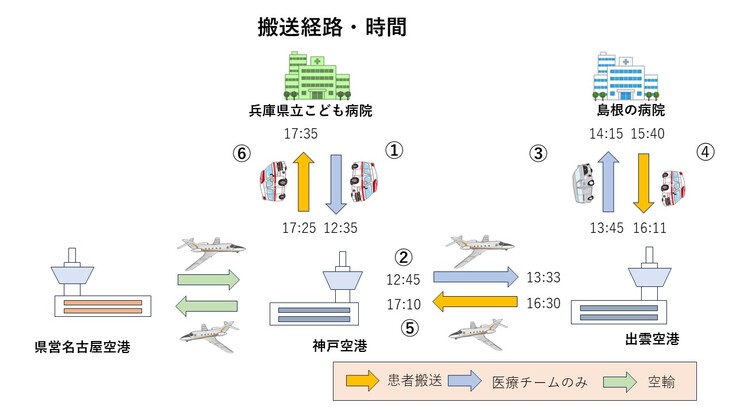 搬送チーム(兵庫県立こども病院)が神戸空港で飛行機に乗り、出雲空港を経て、島根大学医学部附属病院に到着しました。島根大学医学部附属病院で搬送の準備を行い、出雲空港まドクターカーで搬送し、機内に搬入しました。