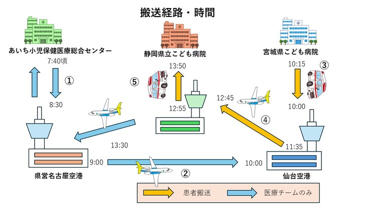 搬送チームがあいち小児保健医療総合センターが担当し、搬送元の静岡県立こども病院に三角搬送(自施設以外に搬送すること)を行いました。