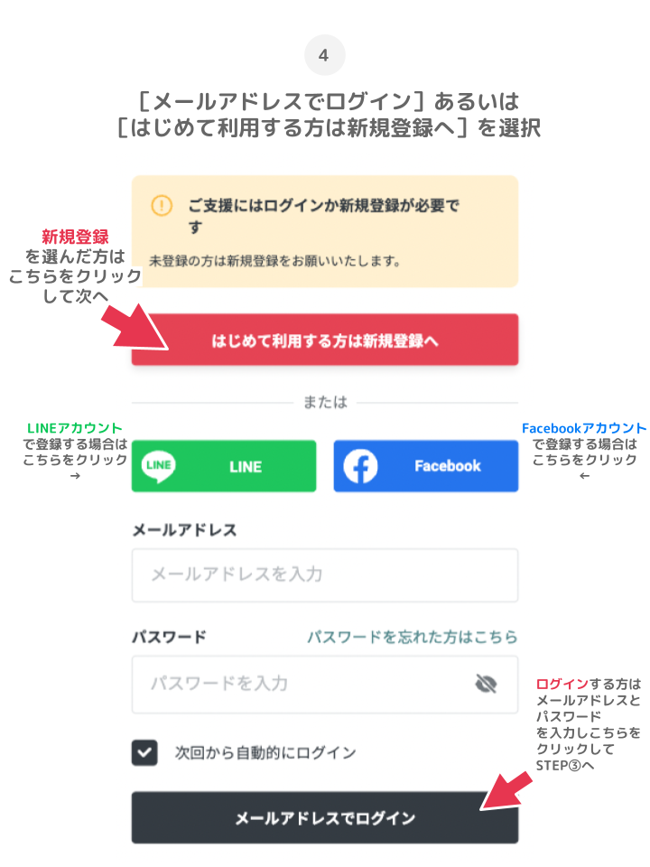 ご支援について、ご利用のPCまたはスマートフォン環境と、ご支援方法に合わせて流れを作成しております。操作方法がわからない方はご確認いただけましたら幸いです。