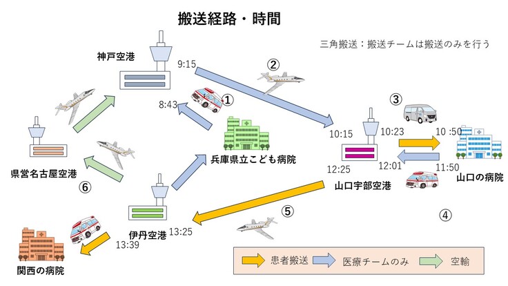 搬送チーム(兵庫県立こども病院)が神戸空港で飛行機に乗り、宇部山口空港を経て、山口県の病院に到着しました。山口県の病院で搬送の準備を行い、出雲空港まドクターカーで搬送し、機内に搬入しました。