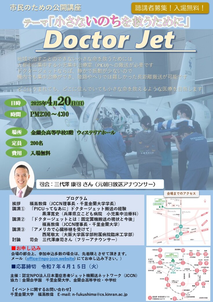 4月20日(日)に、市民のための公開講座「小さな命を救うために」Doctor Jetを開催することになりましたので、お知らせします。多くの方の参加をお待ちしています