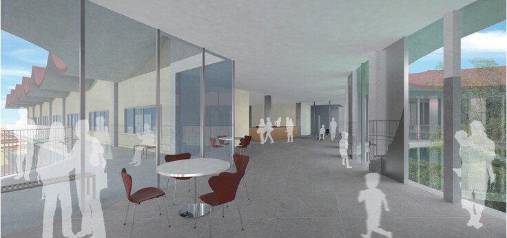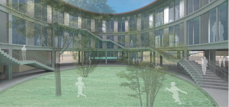 - 病院の中央に「センターサークル」— 心の象徴となる広場を設置。入院中の、外に出られない子どもたちもガラス越しにイベントを楽しめる空間