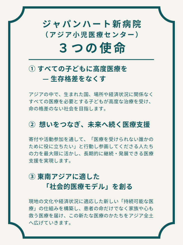 この新病院は、今までよりもさらに大きく、広範囲に高度医療を提供できる、東南アジアの子どもたちの「生存格差(サバイバルギャップ)」をゼロにするための大きな挑戦拠点となることを目指しています。
