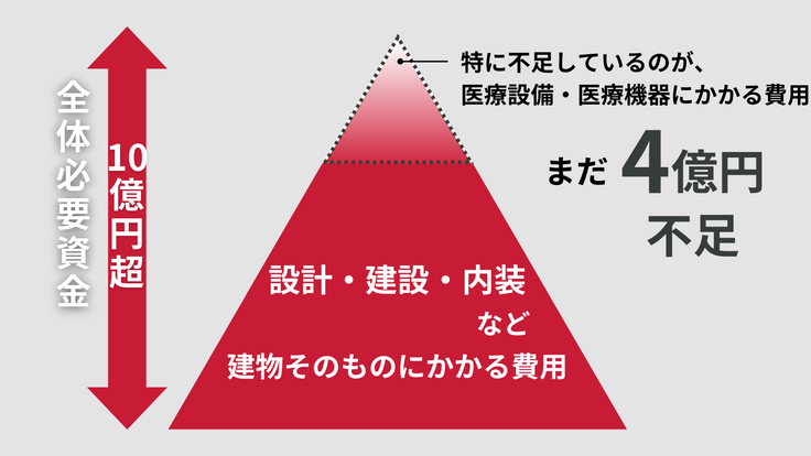 しかし、私たちが目指す形での開院を実現するためには、まだ4億円ほど資金が不足しています。