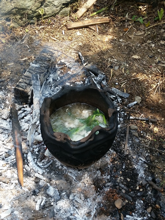 本物の土器でお湯を沸かし、切った野菜とお肉を煮込んでスープ!!