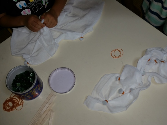 輪ゴムできつく縛ったり、おはじきを入れて縛ったり、割り箸を巻いて縛ったり。