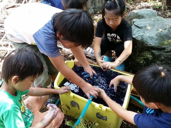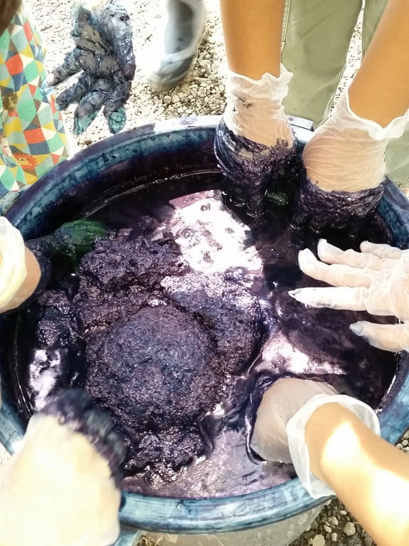 そして~ 6人ずつぐらい交代で、藍の染料の入ったおけにつける!