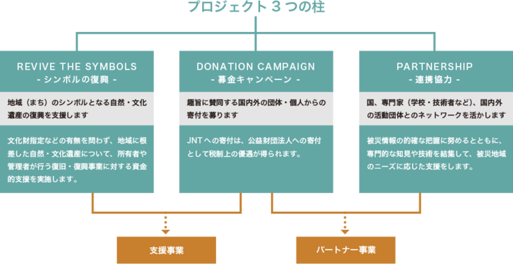 プロジェクトは「シンボルの復興」「募金キャンペーン」「連携協力」の3つを柱に、修理・復旧経費の一部を助成する「支援事業」と、復旧・復興を支援する団体と連携して事業を行う「パートナー事業」の2つの事業を実施しました。