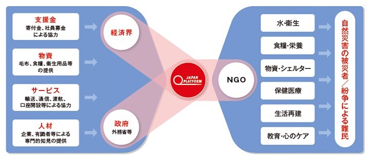 特定非営利活動法人ジャパン・プラットフォーム(JPF)は、多様な人々が強みや資源を生かして連携できるプラットフォームとして機能し、国内外の自然災害による被災者、紛争による難民・国内避難民に迅速かつ効果的に支援を届けます。