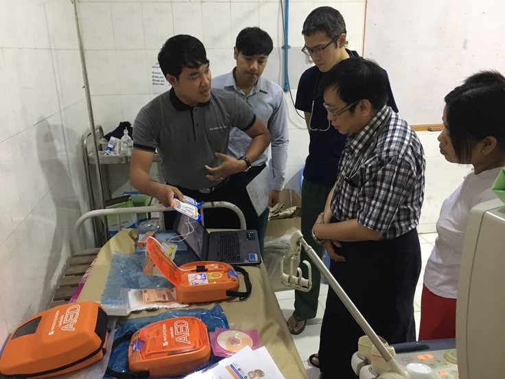日本光電のAED-3100とTRN-3100(トレーニング用)の機器を購入しました。AEDデモ器の使い方をミャンマー医師・看護師と一緒に聞きます。トレーニング用には全部で5種類のパターンのシナリオが内蔵されており、英語の音声(ミャンマー語版はないそうです)にしたがって行動してします。