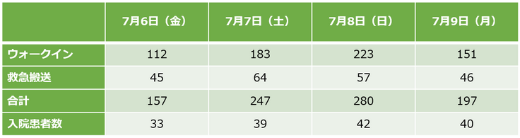 西日本豪雨時初期の救命救急センター受入れ患者数(いずれの日も0~24時)