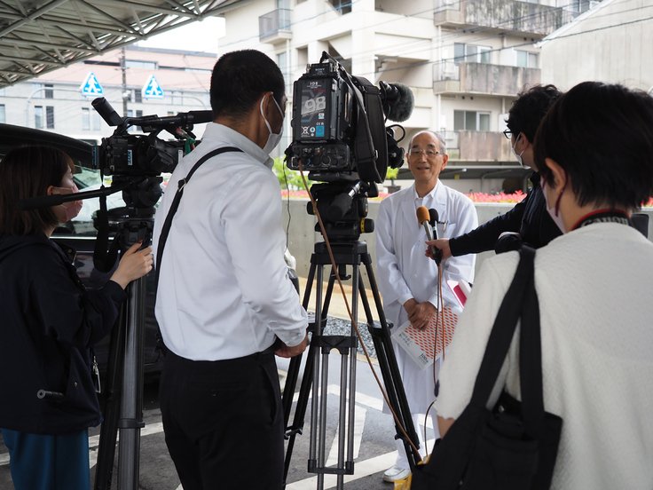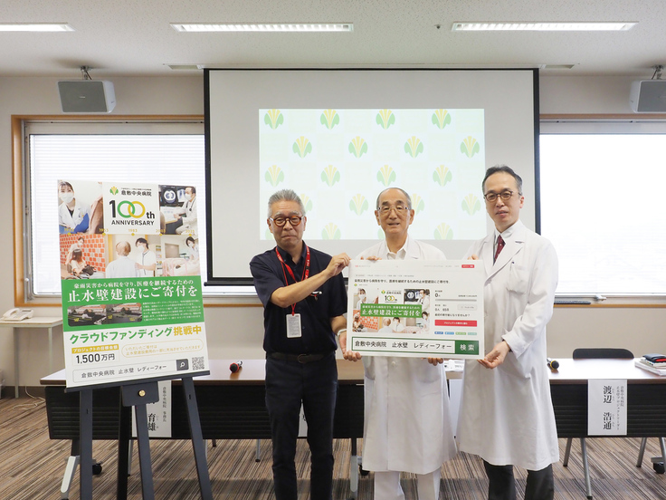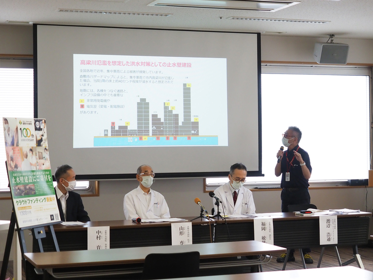 説明会には山形院長、福岡副院長、中村事務長、渡辺施設・環境部副部長(止水壁プロジェクトリーダー)の4人が出席。山陽新聞社様、KSB瀬戸内海放送様、倉敷ケーブルテレビ様の計3社が参加されました。説明会終了後には、当院西側の止水壁建設現場に移動し、工事状況等を撮影いただきました。