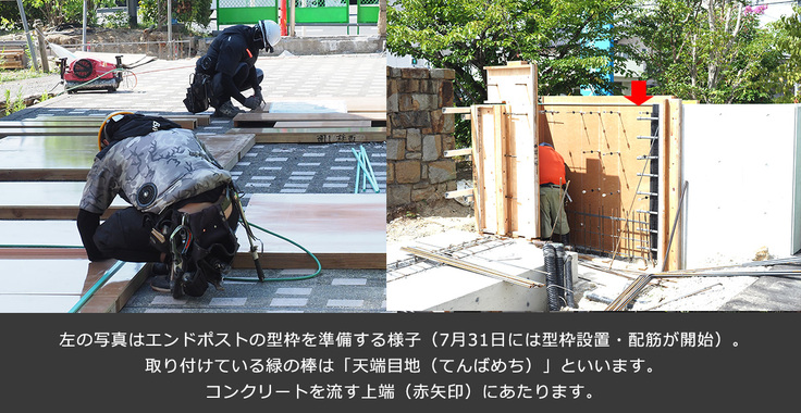 写真は7月28日、病院南西(旧 美和保育園前)の工事現場。こちらではエンドポスト(平常時解放している出入口のアルミゲート設置部分)の型枠準備が進んでいました。