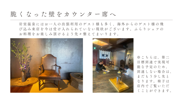 実は㈱ミナト様より、シェフの夢であるカウンター設置に先駆け、空き家整理より大切に保管されていらっしゃった貴重な椅子をお預かりさせて頂きました。第ニ目標に掲げています「脆くなった壁をカウンター席へ」がいつの日か叶う状況が整いましたら、こちらの椅子をカウンター席で活用させて頂きたいと思っております。