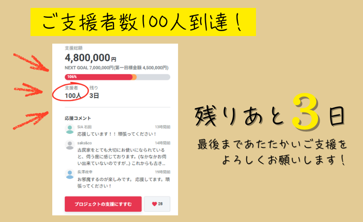 クラウドファンディング終了まで残り【あと3日】となりました。あたたかい応援・ご支援、本当にありがとうございます。
