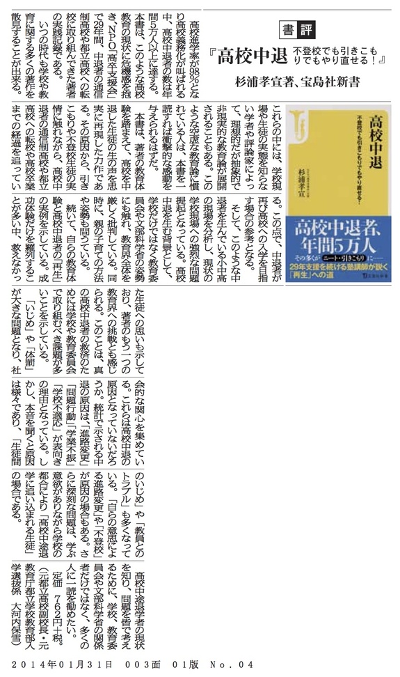 東京は10年ぶりの大雪でした。拙著、『高校中退』の書評が都政新報さん=読者層東京都職員さま。に載りました。先日、この書評を持って、都庁や各区の教育委員会、中学高校を回っております。後日、皆様に良い報告ができるように頑張っています。