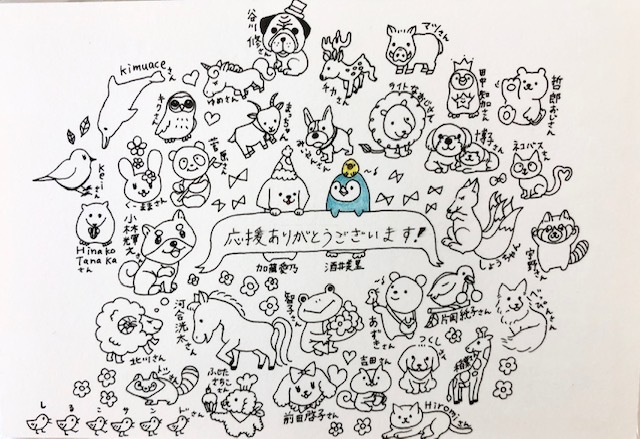 今描いている細かい支援者様をイメージした動物達が集まった「アニマムパーティー」というイラストがだんだんと出来上がってきました。