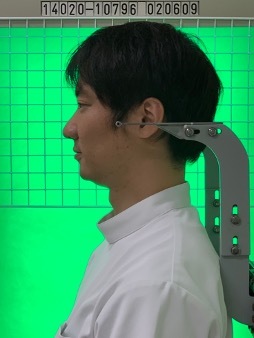 加えて、頭の傾きや頭の位置の変化も計測し、不正咬合の改善が頭や首の姿勢にどう影響するのかも併せて調査します。以下のような装置を使用し、あごの突出度の変化や頭や首の姿勢の変化を確認します。