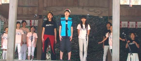 (地元のお祭りにイベント出演した時の福岡子どもミュージカルの子どもたち)