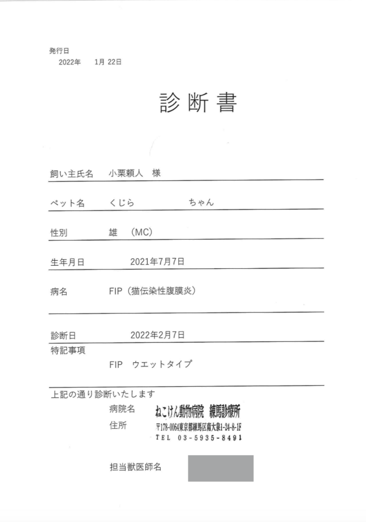 猫の命に関わる病気FIP(猫伝染性腹膜炎)にかかってしまったくじらの家族の小栗と申します。