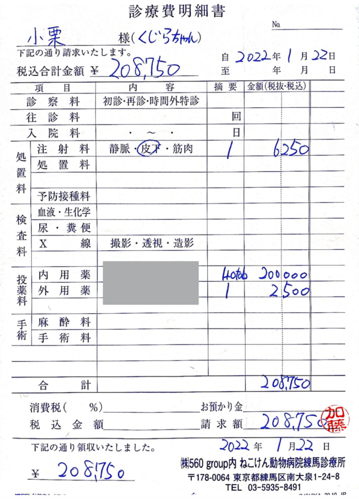 このFIPという病気には特効薬と言われている薬がありますが、日本では認可されておらず非常に高額で、2.1kgのくじらで60万円以上かかります。さらに検査費やその他のサプリメントなど薬代、東京までの交通費などを考えると90万円は超えてしまいます。