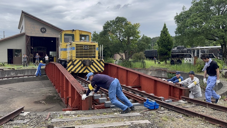 手押しでディーゼル機関車の載った転車台を、4号のいる線路へと転回(SL広場友の会の皆様)