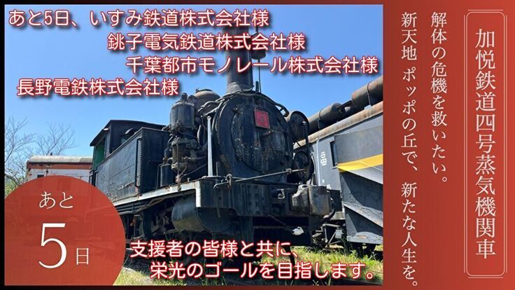 残り5日、あと【148万円】で、長野、そして加悦の地で響かせた汽笛を、ポッポの丘でまた響かせることが叶います!