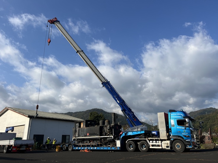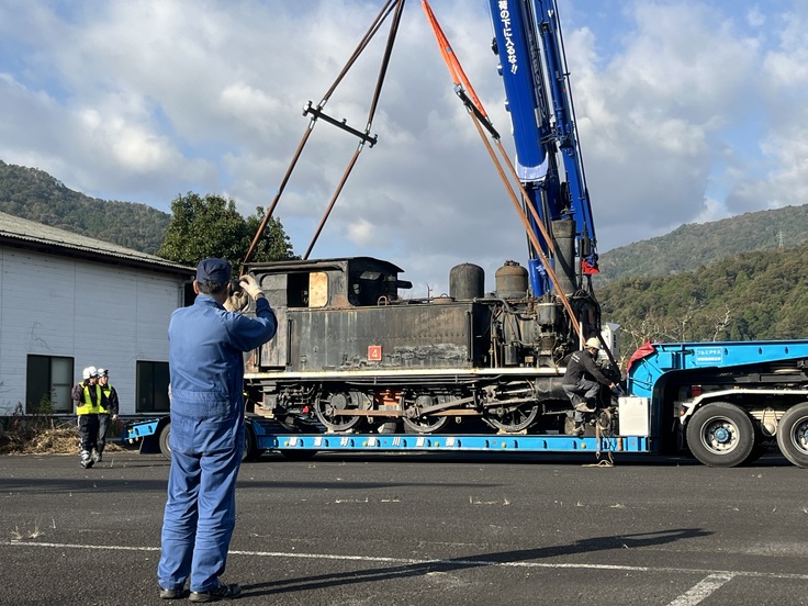 お天気も良く、関係者や長年お世話になった宮津海陸運輸株式会社や、SL広場友の会の皆様、加悦鐵道保存会様、そして返礼品の出発式にご支援いただいた支援者の皆様に見守られながら、大きなトラブルもなくトレーラーの荷台へと収まりました。