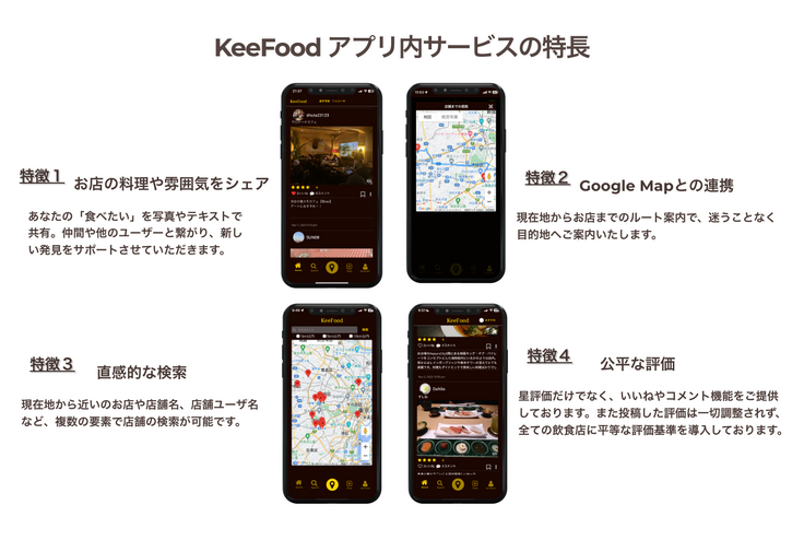 この会話がきっかけで、私たちは「KeeFood」の開発に着手しました。KeeFoodの魅力は、飲食店の検索から予約、訪問、そして共有までの全プロセスを一つのアプリケーションで完結させることです。