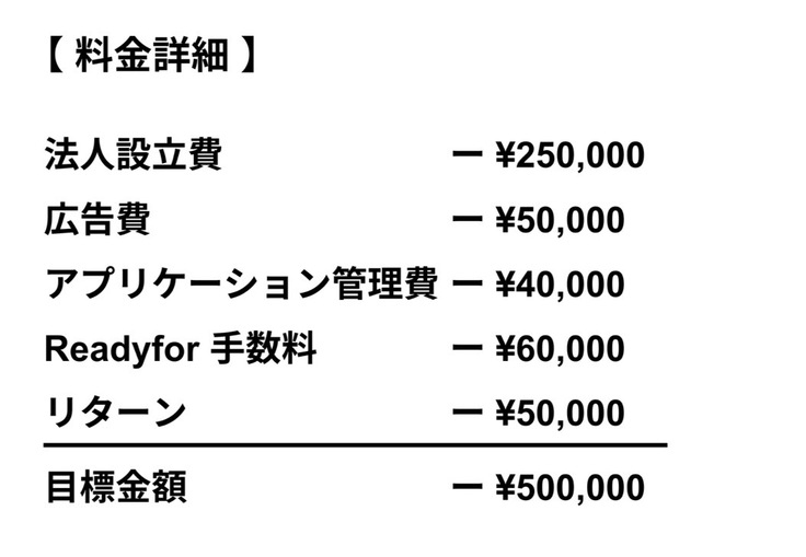 今回、皆様には会社設立にあたる創立費とアプリケーションの利用者を増やすための広告費をご支援いただきたいと考えております。
