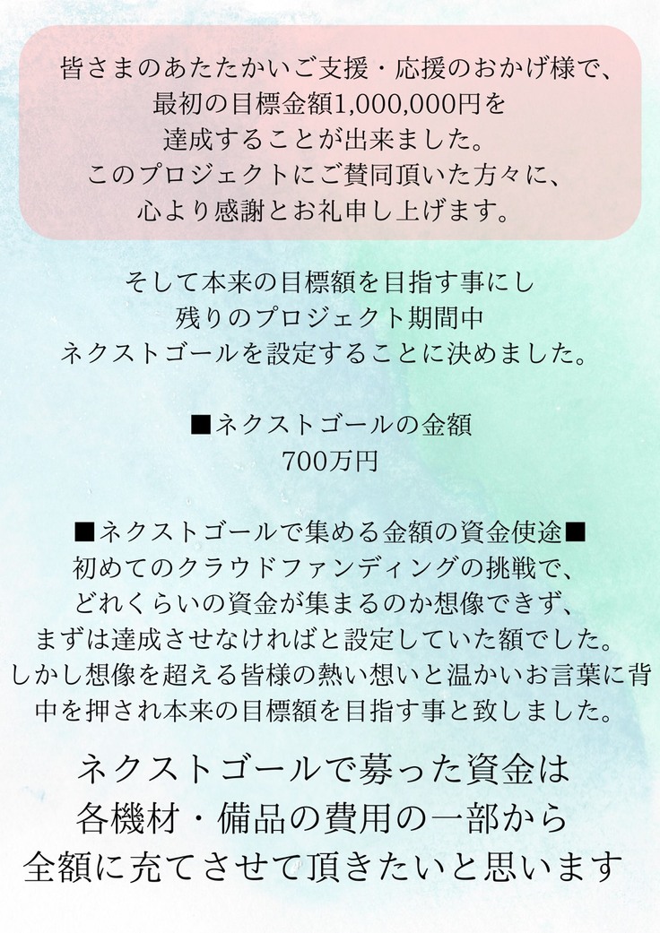 ネクストゴールを超えたご支援金の使用用途について決まりましたのでご報告させていただきます。