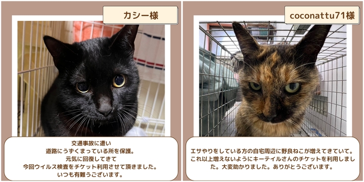当初は不妊去勢手術支援としてご寄付をいただきましたが、愛護活動者様や団体様はTNR活動と保護活動を両方されている場合が多いため、ワクチン・ウイルス検査の負担が減れば、結果的にTNR活動に使える費用が増えると考えております。