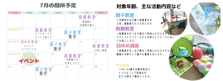 5月からのプレオープンでは様々な親子やボランティアの方にお越しいただき色々な意見を頂きました。そのことを踏まえ、7月からは色々な活動やテーマを準備して皆さんをお待ちしております‼︎
