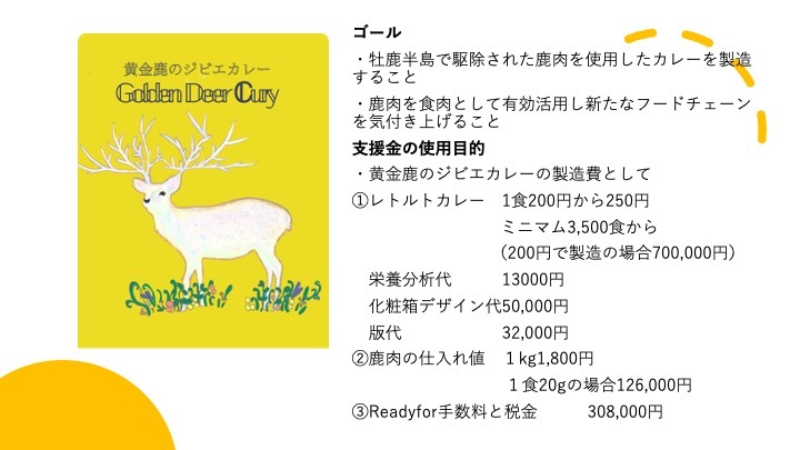鹿肉を使ったカレーのレシピを工場に送り、試作品を使ってもらう。それと並行してカレーのレトルトを入れる箱のデザインと製造をして完成したら工場におくる。 【資金使途】ジビエカレー製造費(材料仕入費・栄養分析代・化粧箱デザイン)、READYFOR手数料、税
