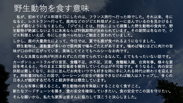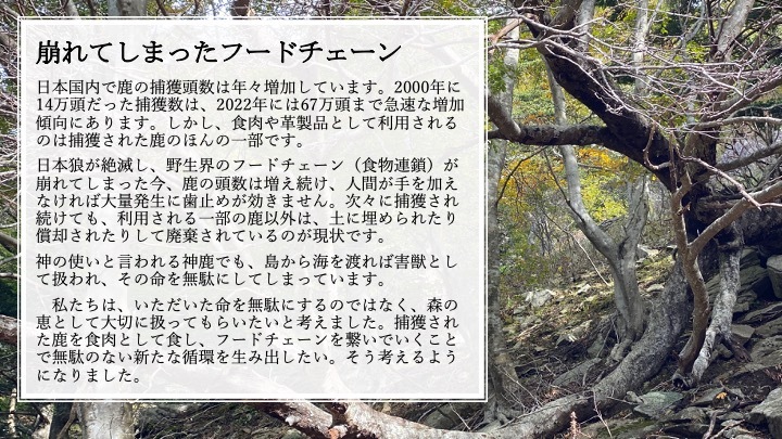 駆除された鹿肉を有効活用して作ったドッグフードや、駆除された鹿で料理を提供しているレストランなどで、ほとんどの駆除された鹿が廃棄されていると知りました。石巻市に問い合わせたところ、牡鹿半島の鹿も例外ではなく、定期的に駆除されていると知りました。鹿の命を無駄にしたくない、駆除された鹿肉を再利用する活動に自分たちも貢献したいと思い、自分たちにも何かできることはないかと家族で考えました。そこで、日本人に馴染みの深いレトルトカレーに鹿肉を入れて製造したいと思い立ちました。