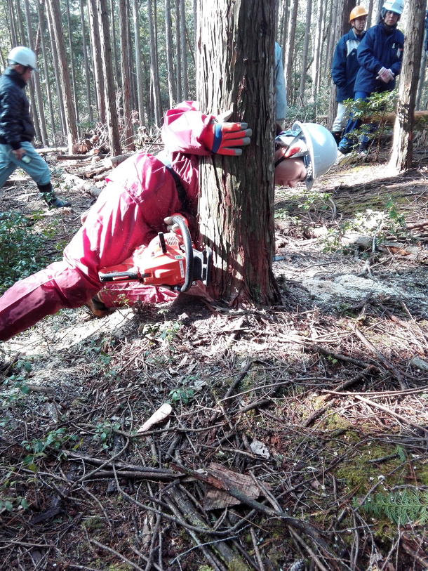 写真は、「突っ込み切り」と言われる切り方です。チェーンソーの先端を木に突っ込むのですが、山の斜面でも機械を水平にして切っていく技術が求められます。また、目立てといってチェーンが良く切れるように、ヤスリで研ぐ技術も必要になります。
