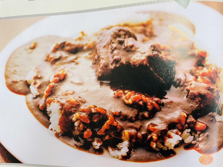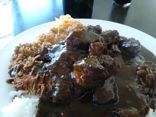 超濃厚な豚骨スープをベースにさまざまな野菜やワインをとことん煮込み、市販のルーは使わず「小麦粉 / ラード / 特別に仕入れた石臼で挽いた薫り高いカレー粉」を使用し作るルーを使い、トロトロに煮込んだ豚バラ肉が入った欧風カレーは真っ黒な色の深い味わいです。