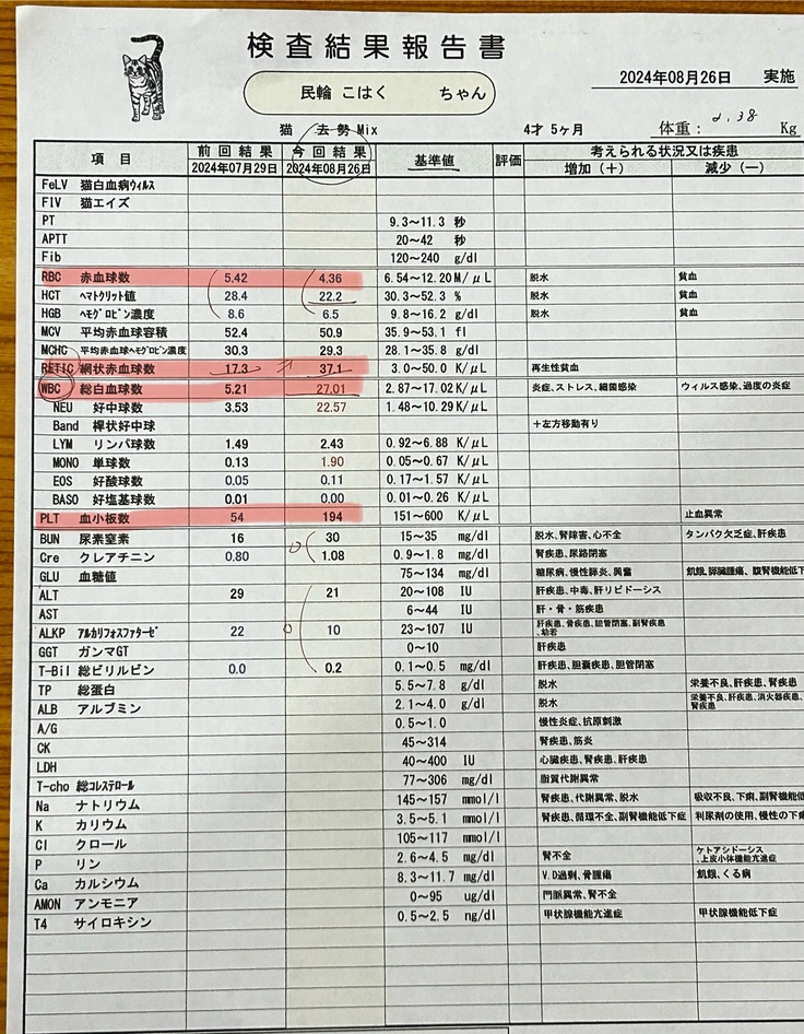 白血球数値が高く、どこかで炎症が起きてるかもしれないそうです。