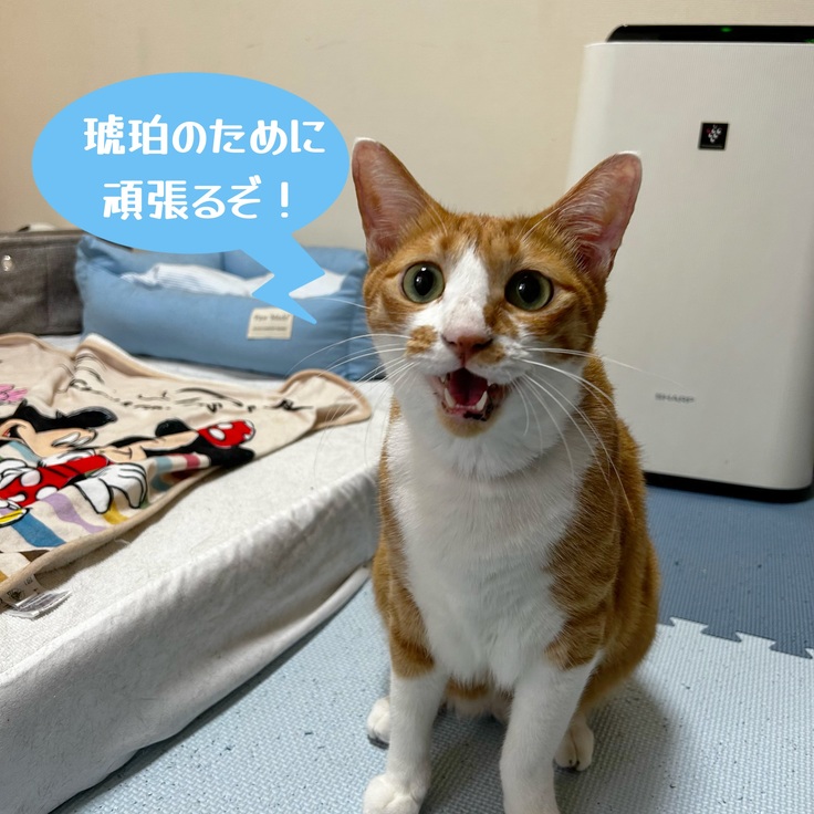 琥珀は、インスタライブをしている時の部屋にいます。本当はみんながいるところがいいんでしょうが、子猫達がホースを噛みそうなので隔離しました。