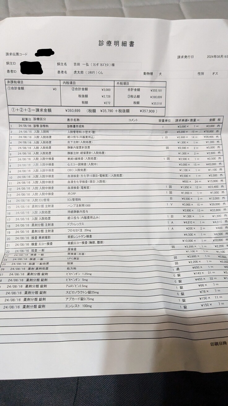 この入院費に関しましてはプロジェクト開始時点で総額不明瞭だったので目標額などには含めておりませんが今後同じ状態になってしまう子の為にも参考として添付致します。約40万円ほどかかりました。