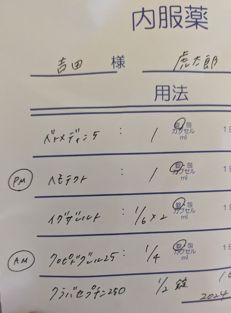 お薬は強心剤、血栓予防薬2、抗生剤、栄養剤