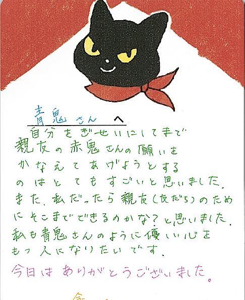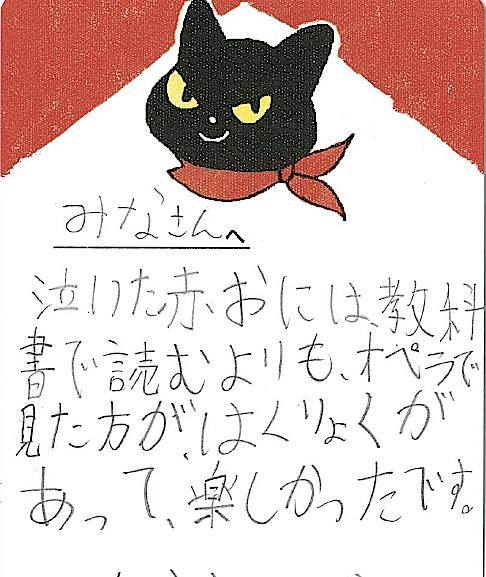 着ぐるみ「のら猫クロッチ」は、お客様とのコミュニケーション役で登場です。観劇後に子どもから大人まで、たくさんの感想をいただきました。その中からの5通を紹介します。