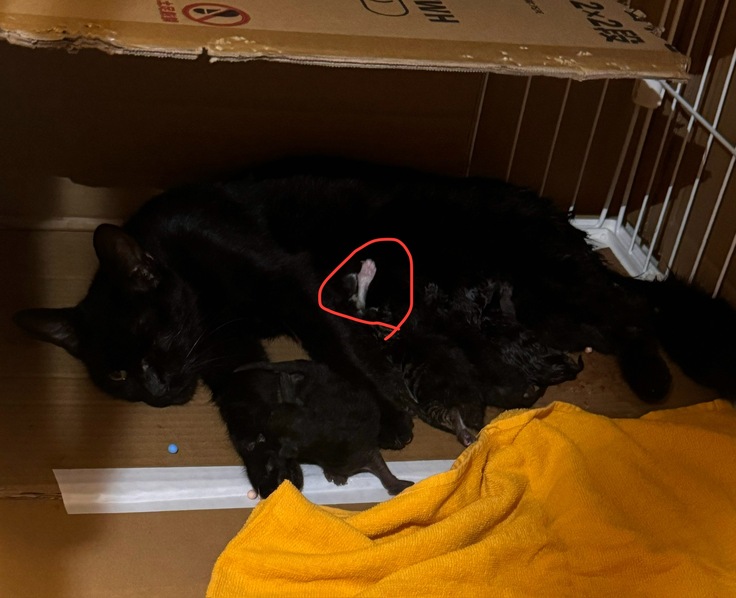 黒猫ちゃんが夜中に泣いてて新しいゲージだし不安で怖いんだろうな、、と思ってたのですが陣痛だったようです。