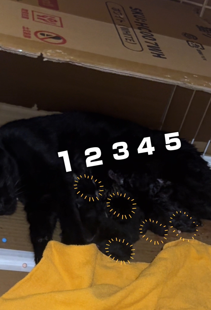 人間の匂いがついてしまうと育児放棄をしてしまう可能性があるみたいなので今から1ヶ月はそっとして黒猫ちゃんに母親を頑張ってもらいます。