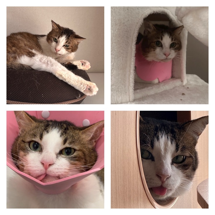ストレスで身体にハゲができたり、おしっこの失敗が続いたりもしました。2ヶ月たったぐらいでエリザベスカラーは小さいものに変えてみてもよいとの事だったので、柔らかいのが良さそうだなと思い購入したのですがひっくり返ってしまい1週間ぐらいでまた普通のカラーになりました。笑✨顎のズレはどうしても治らずベロが出てしまいますがそれも可愛いです。