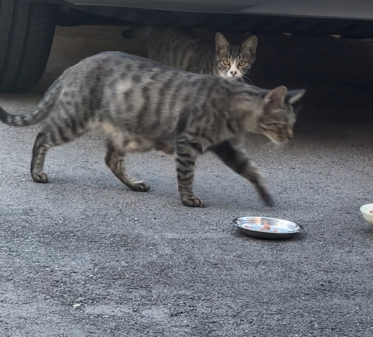 ここ最近姿を見せていなかったさっちゃんが、なんと子供と思われる2匹の猫ちゃんを連れて戻ってきてくれたんです!この2週間ほど、さっちゃんがいなくて心配していましたが、元気な子供たちを連れてきてくれたことにとても感激しました。