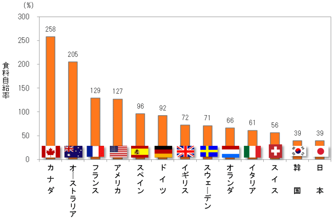 出典:農林水産省 「農林業センサス累年統計年齢別基幹的農業従事者数」、 「食料需給表」、「世界の食料自給率」