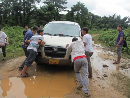 プロジェクト開始から約2カ月が経ちました。雨季のこの季節は、現場に行くのも一苦労。添付は、先日活動をしに行く途中で起きたハプニングです。