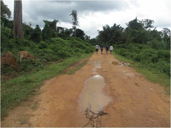 (プロジェクト車は川の手前に置いてきたので)その先は、通りがかったバンで村へ。しかし、途中の悪路で車が止まってしまい、結局あと村まで1キロほど、というところでこの車も置いて、歩いて行きました。